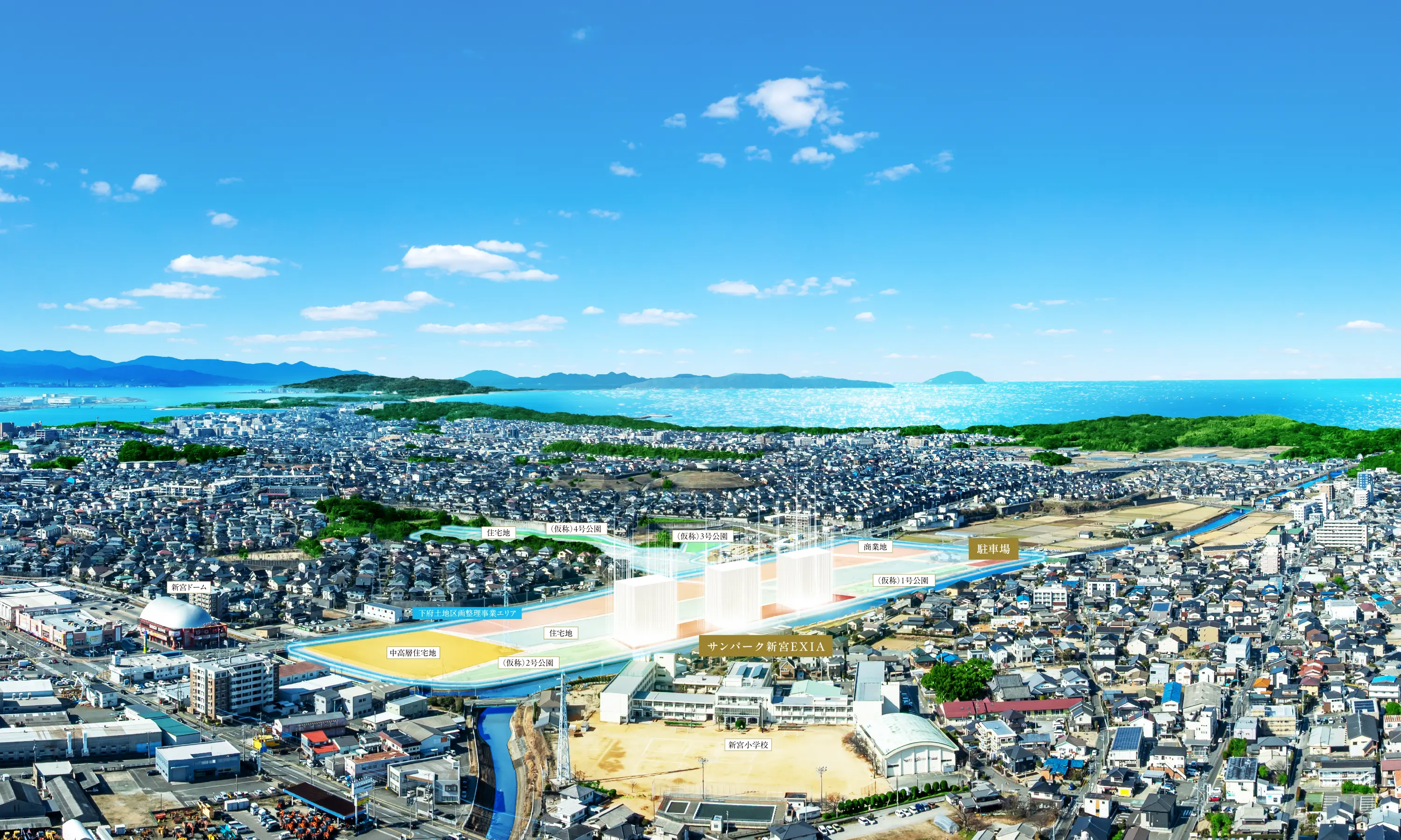 下府地区は近くに西鉄「新宮」駅やJR「福工大前」駅、小・中学校があり、県道湊下府線が横断しているなど利便性に優れています。地区内には、敷地の緑化や建物の形態・デザインなどを統一した良好なまちなみが形成された住宅地を中心に、商業施設などの生活利便施設を誘致する予定です。また、浸水対策として地盤の嵩上げしています。